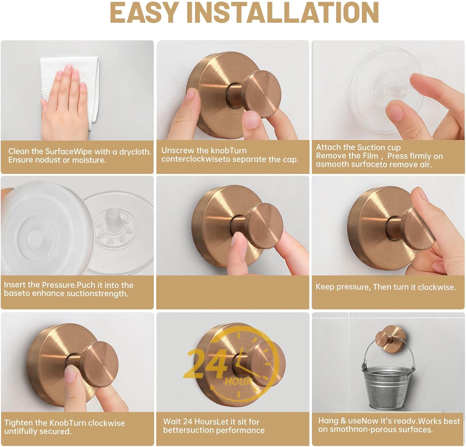 - 【Effortless Installation without Damage】 Say goodbye to drilling or screws! Simply press or twist the hook onto any smooth, dry surface in seconds. It’s detachable, reusable, and leaves no marks — perfect for renters or anyone looking to avoid wall damage