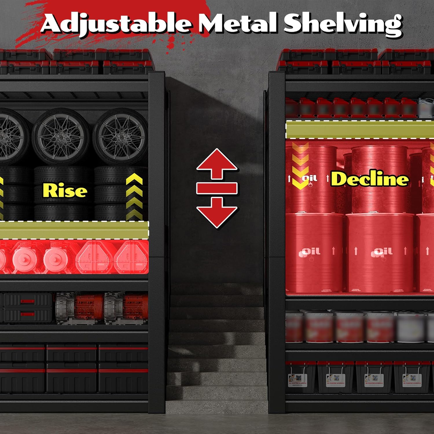 - 【Flexible Storage Shelves with Adjustable Height】Shelf heights are fully adjustable to accommodate items of any size, from paint cans to tall toolboxes. For added flexibility, the shelving unit can be divided into two separate racks, solving space challenges under workbenches or in cramped corners for a customized storage solution. Customization is simple