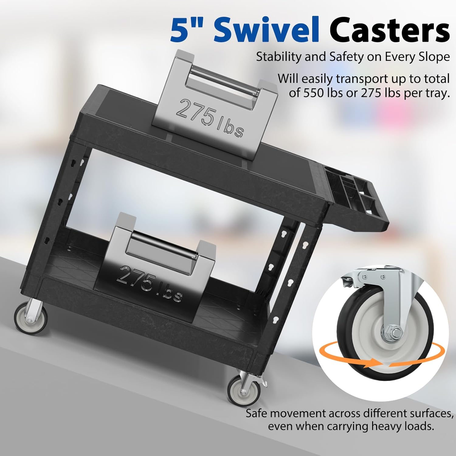 - 【Heavy-Duty Load Capacity】 Constructed from high-quality polypropylene (PP), this rolling utility cart is lightweight yet durable, resistant to scratches, rust, and dents, supporting up to 550 lbs (275 lbs per shelf). Perfect for use as a tool cart on wheels, work cart, or plastic utility cart for heavy-duty tasks.