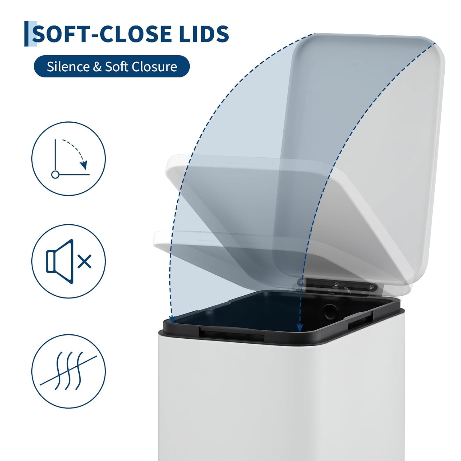 - 【Silent Soft-Close Lid】The slow-closing lid prevents loud slams—perfect for late-night cleanup in kitchens or bathrooms. Enjoy a quieter home while keeping odors contained.