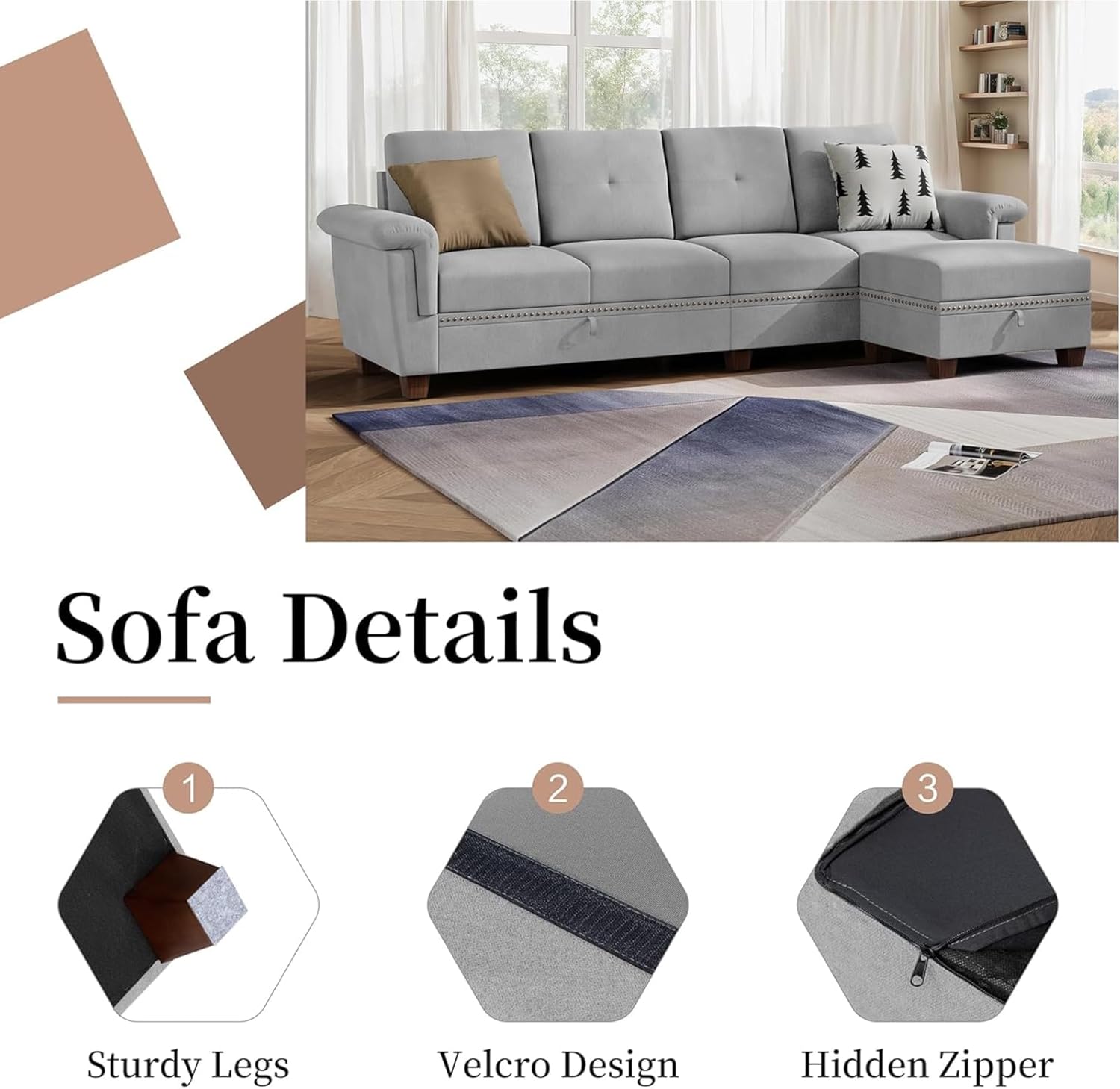 JAMFLY 108" Modular Sectional Sofa with Storage, L Shaped Sofa Couch with Reversible Ottoman, 4-Seat Convertible Sectional Couches with Cup Holders for Living Room, Apartment, Light Grey