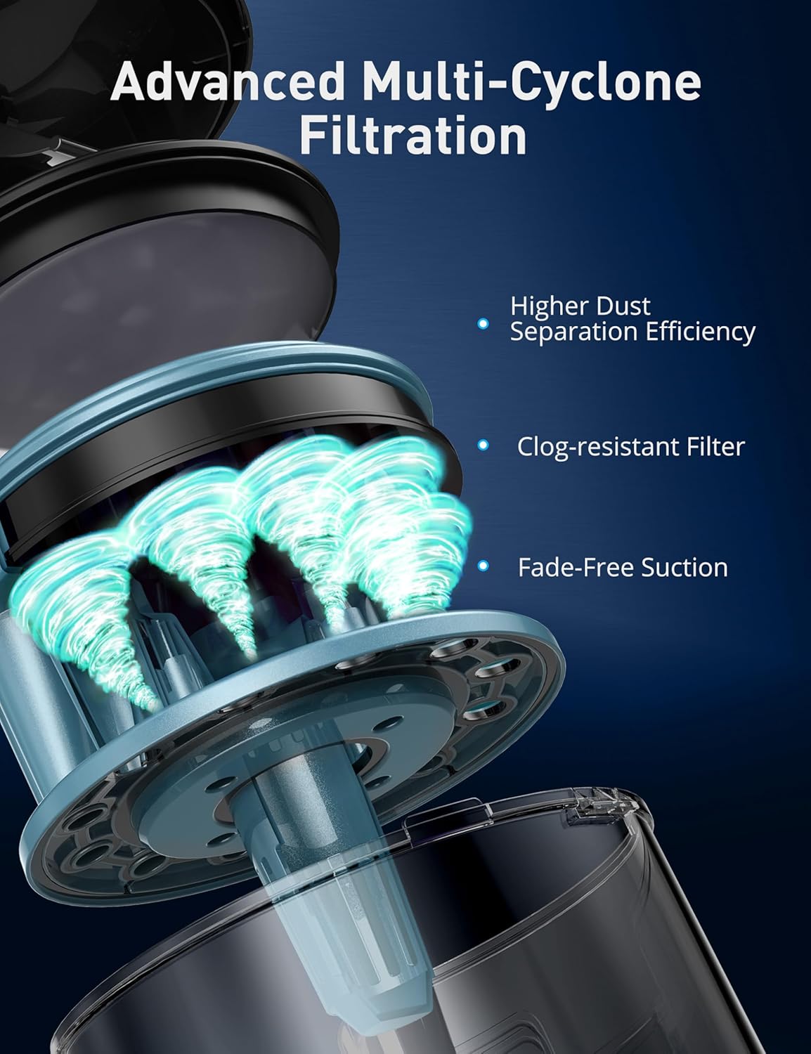 - Long-Lasting Suction: The multi-cyclone filtration structure maximizes dust separation efficiency, prevents clogging, and ensures fade-free suction power, while also eliminating the need to frequently replace the filter.