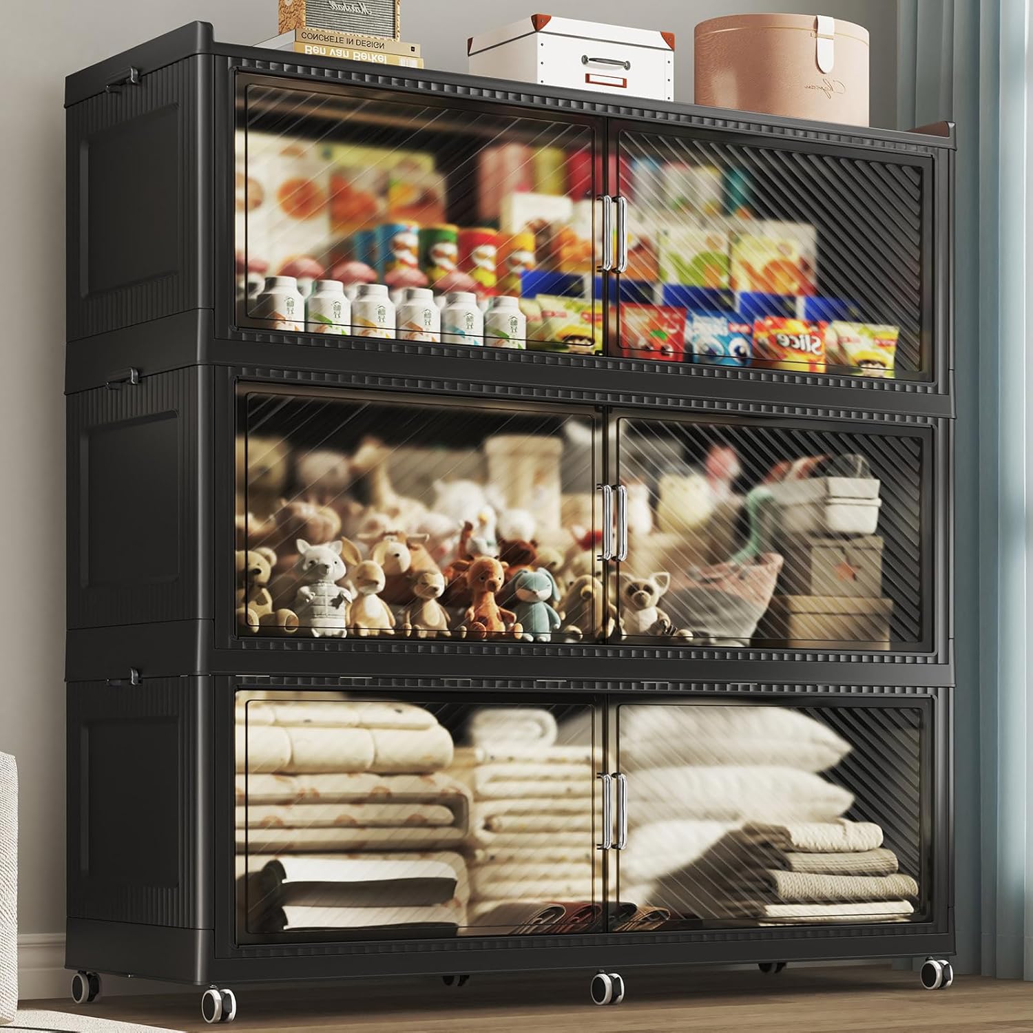 240GAL Extra Large Storage Bins with Lid, 960QT Collapsible Organizer with Wheels, Stackable Closet Cabinet with Doors, Folding Storage Containers for Home, Office, Dorm, 3Pack Black